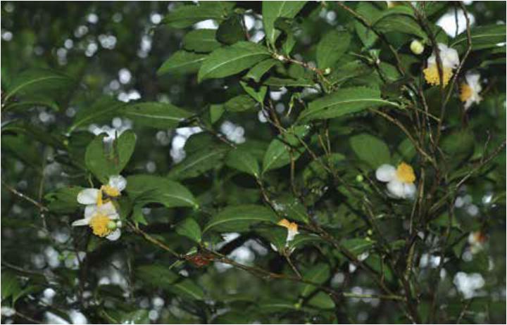 單花,假頂生。花梗具環形花托。苞片2,早落。花近輻射對稱,白色。花萼 5,三角狀闊卵形,深綠色,覆瓦狀排列。花瓣約 7 枚。雄蕊多數;花絲白色;花藥 2 室,縱裂。子房扁狀球形;花柱 3 或 4 叉;柱頭點狀。 果實近球形,外表光滑油亮,熟深褐色。種子約1枚育成,其餘萎縮。 引證標本︱新北市平溪區衛福部國家藥園A步道 Hsu 20410(TAIE) 典籍記載︱葉味甘苦性涼,收斂、滋補、調節新陳代謝、促進免疫系統、提神解渴、清熱利尿、消滯止瀉,治腸炎、痢疾、消化不良、感冒等。茶花味苦性涼,清肺平肝,主治鼻疳、高血壓等。茶子(果實)味苦性寒有毒,降火、消痰、平喘,治痰熱喘嗽、頭腦鳴響等。茶樹根味苦性涼,強心利尿、活血調經、清熱解毒,治心臟病、水腫、肝炎、痛經、瘡瘍腫毒、口瘡、湯火灼傷、帶狀皰疹、牛皮癬等。《台灣藥用植物資源名錄 p319》《中華本草》 藥理研究︱神經保護作用:抗腫瘤、抗轉移和抗骨質溶解作用、抗菌和腎保護作用:抗高血脂、高血糖作用。 |