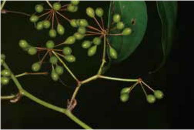 雌雄異株;繖形花序呈總狀排列,腋生。苞片卵狀三角形。花輻射對稱,紫紅色,雄花徑約 10 mm,雌花徑約4.5 mm。花被片 6,雄花被長橢圓形,黃綠色泛紫紅,先端內凹呈舟狀並向翻捲;雄蕊 6 枚;花絲黃綠色;花藥 2 室,縱裂。雌花被卵狀披針形。子房倒卵球形;花柱極短;柱頭 3 叉,舌狀;胚珠倒卵球形;具退化雄蕊 3 枚。 漿果狀核果,倒闊卵球形,熟紅褐色。種子1,近圓球形,紅褐色,光滑。 引證標本︱新北市平溪區衛福部國家藥園B步道 Hsu 20460(TAIE)、新北市平溪區衛福部國家藥園A步道 Hsu 20572(TAIE)、Hsu 20577(TAIE) 典籍記載︱根莖味甘淡性平,解毒。葉外用敷腫毒、創傷止血。《台灣藥用植物資源名錄p.131》 藥理研究︱抗氧化作用。 |