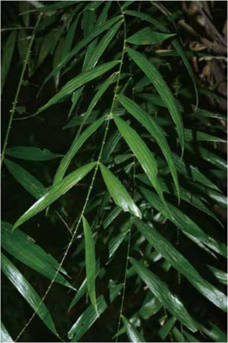 多年生攀緣藤本,全株具刺;雄花具特殊氣味。羽狀複葉,互生。葉柄鞘狀包莖,密被長硬刺;羽軸具硬質倒鉤刺,末端延伸成鞭狀。小葉革質,披針形,兩面深綠色,葉面皺摺狀;先端漸尖,略尾狀;基部鈍;全緣,疏被芒尖。