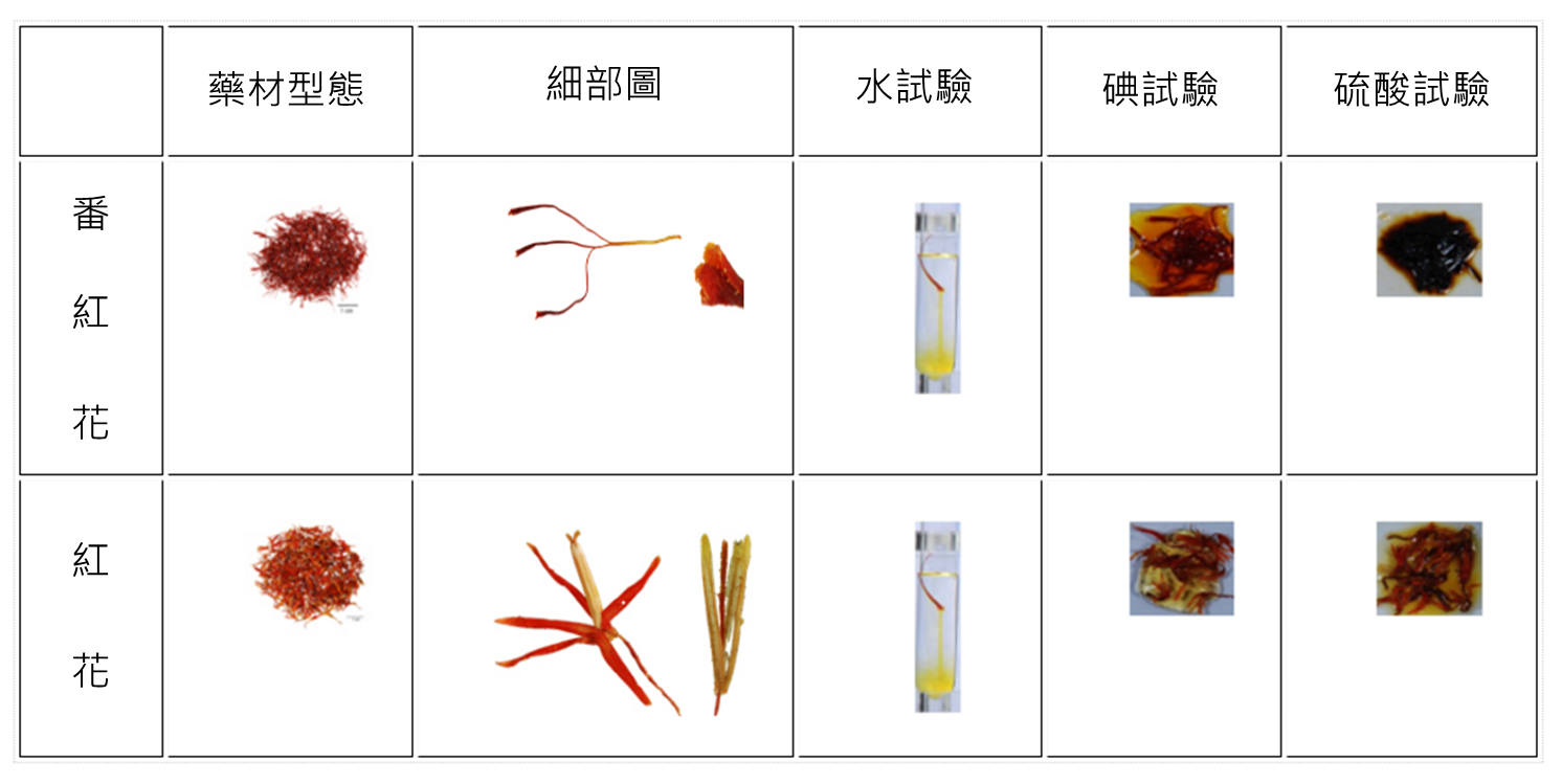 在現代,除了可以從藥材的外觀判別番紅花的真偽以外,我們也可以從一些理化實驗去做鑑定。詳見圖2的番紅花之水試驗、碘試驗、硫酸試驗的鑑別結果。