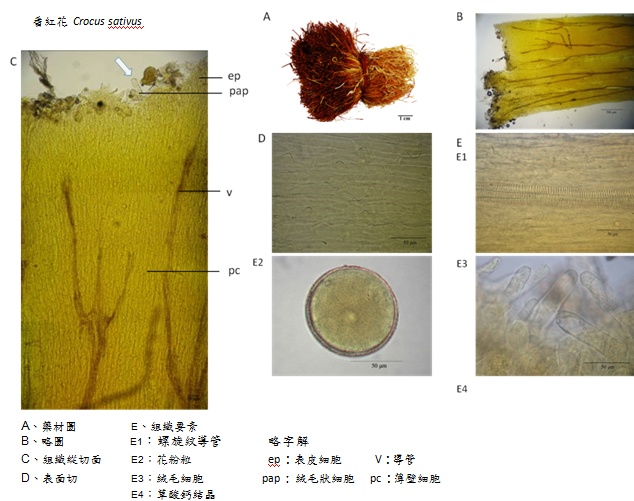 番紅花的上表皮細胞表面呈長條形,壁薄,微彎曲,有的外壁突出呈乳頭狀或絨毛狀,表面隱約可見纖細紋理。柱頭頂端表皮細胞絨毛狀,表面有稀疏紋理。薄壁細胞內含草酸鈣結晶,呈顆粒狀或圓簇狀。導管多為螺旋紋導管,導管旁常伴生纖維。花粉粒為圓球形,淡黃色,內含有微小顆粒狀物質。詳見圖3的番紅花之顯微鑑定。