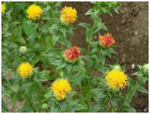 紅花 (外觀圖示如圖4) 英文名Safflower,為菊科的一年生植物。原產於亞洲、非洲部分地區,在埃及已有4000多年的栽培歷史。現在歐洲、美洲、澳大利亞和中國等許多地方都有栽培。印度栽培紅花面積最大,為60多萬公頃,約佔世界紅花面積的50%;在中國自魏朝至今亦有1700多年的栽種歷史。目前在中國的各地多有栽培,主要產於河南、新疆、河南、四川和浙江等地。紅花又名紅藍花、黃藍、刺紅花、草紅花。
