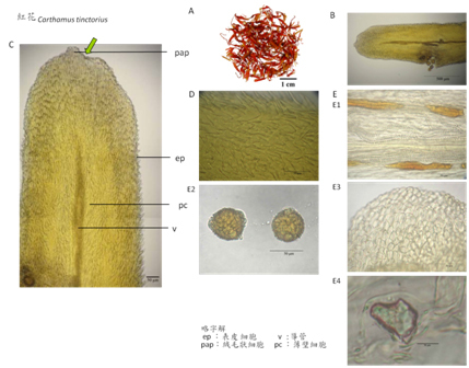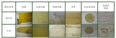 紅花的頂端表皮細胞外璧突起呈短絨毛狀。上部表皮細胞分化成圓錐形單細胞毛。草酸鈣方晶存在於薄璧細胞中。導管多為螺旋紋,常伴有管狀分泌細胞,內含紅棕色分泌物。花柱、花絲、花冠中均可見紅色長管道狀分泌細胞。花粉粒深黃色呈類圓形,具有3個萌發孔,外璧有齒狀突起。詳見圖5的紅花之顯微鑑定。