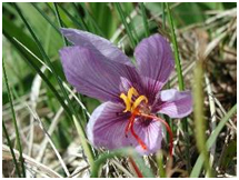 番紅花的學名是Crocus sativus L.為鳶尾科多年生草本植物,Crocus來自希臘語krokos (絲狀之意),指柱頭乾燥後的絲狀;sativus意指「栽培的」。番紅花的地下鱗莖呈球狀,外有黃褐色膜質鱗葉。葉基生,9~15片呈細長條形,葉緣反卷具細毛,基部有4~5片橢圓鞘狀葉包覆。花莖甚短,不伸出地面;花頂生,花被裂片6片呈倒卵圓形,淡紫色,花筒細管狀;雄蕊3枚,雌蕊3根,子房下位狹紡錘形;花藥黃色,頂端尖,略彎曲;花柱細長呈橙紅色,雌蕊柱頭頂端楔形略膨大有3分枝,較雄蕊長。花柱及柱頭供藥用,即番紅花,體輕,質鬆軟,乾燥後質脆易斷。蒴果,長形,具三鈍棱,種子多數,圓球形,種皮革質。花期11月上旬至中旬。詳見圖1的番紅花。