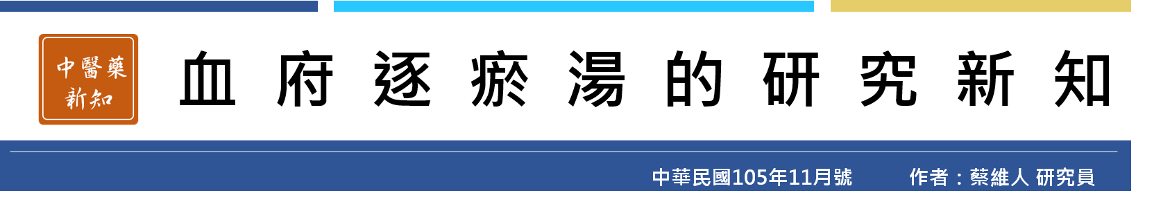 「血府逐瘀湯」是清代醫家王清任 (1768~1831) 唯一著作《醫林改錯》(1830) 關於活血化瘀 22 方劑中五逐瘀湯(血府逐瘀湯、膈下逐瘀湯、少腹逐瘀湯、身痛逐瘀湯、通竅活血湯)之首 [1];與補陽還五湯均為活血化瘀的名方,至今仍為臨床廣泛應用 [2, 3]。本方主治瘀血內阻胸中、氣機鬱滯、陽氣不得宣發以致胸痛煩悶、心悸失眠等「胸中血府血瘀」之證 [4]。
